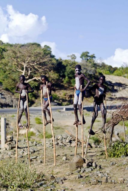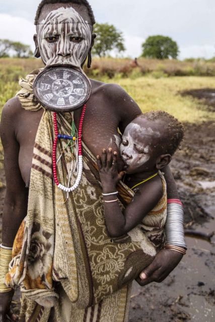 也有一說是為防止部落戰爭時婦女被擄走,便要求族裡的女人割開下嘴唇放入盤子,醜化自己以防被搶,但唇拉越大後來這反而成為部落裡美麗的象徵。進入部落前,乍見孩子們臉上塗鴉踩著細長木棍製作的高蹺迎接畫面,內心已經驚奇,而部落裡的婦女們沉默地坐著,身體的線條與背景的山坡融在一起。下唇垂墜著陶盤,皮膚被陽光曬得深褐而有光澤,臉上塗劃著直式或滿臉的白色線條。