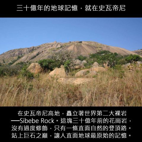 在史瓦帝尼首都姆巴巴內不遠處,有一座幾乎直立於大地之上的巨石──Sibebe Rock。它是全世界第二大裸岩,僅次於澳洲的烏魯魯(Ayers Rock),年齡甚至被地質學家推測達到三十億年。