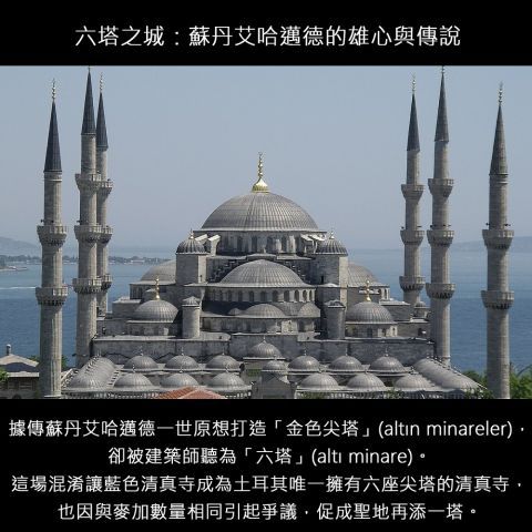傳說中,蘇丹艾哈邁德一世命令建造「金色尖塔」(土耳其語 altın minareler),但建築師誤聽為「六座尖塔」(altı minare),誤會竟造就歷史奇觀。當時全球唯一擁有六座尖塔的,是麥加大清真寺。這座新清真寺的誕生因而被視為挑戰聖地權威。為化解爭議,蘇丹據說資助在麥加再建第七座尖塔。如今藍色清真寺成為伊斯坦堡的象徵之一,以藍色伊茲尼克瓷磚與錯聽傳說並存,見證信仰、語言與權力的交織。