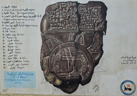 通過伊斯塔城門,走進巴比倫城遺址內的第一站,首先導覽牆上的一塊泥板。出土在此地的這塊小小的泥板(原版現存於英國大英博物館)上,巴比倫人把自己放進了圓心。
