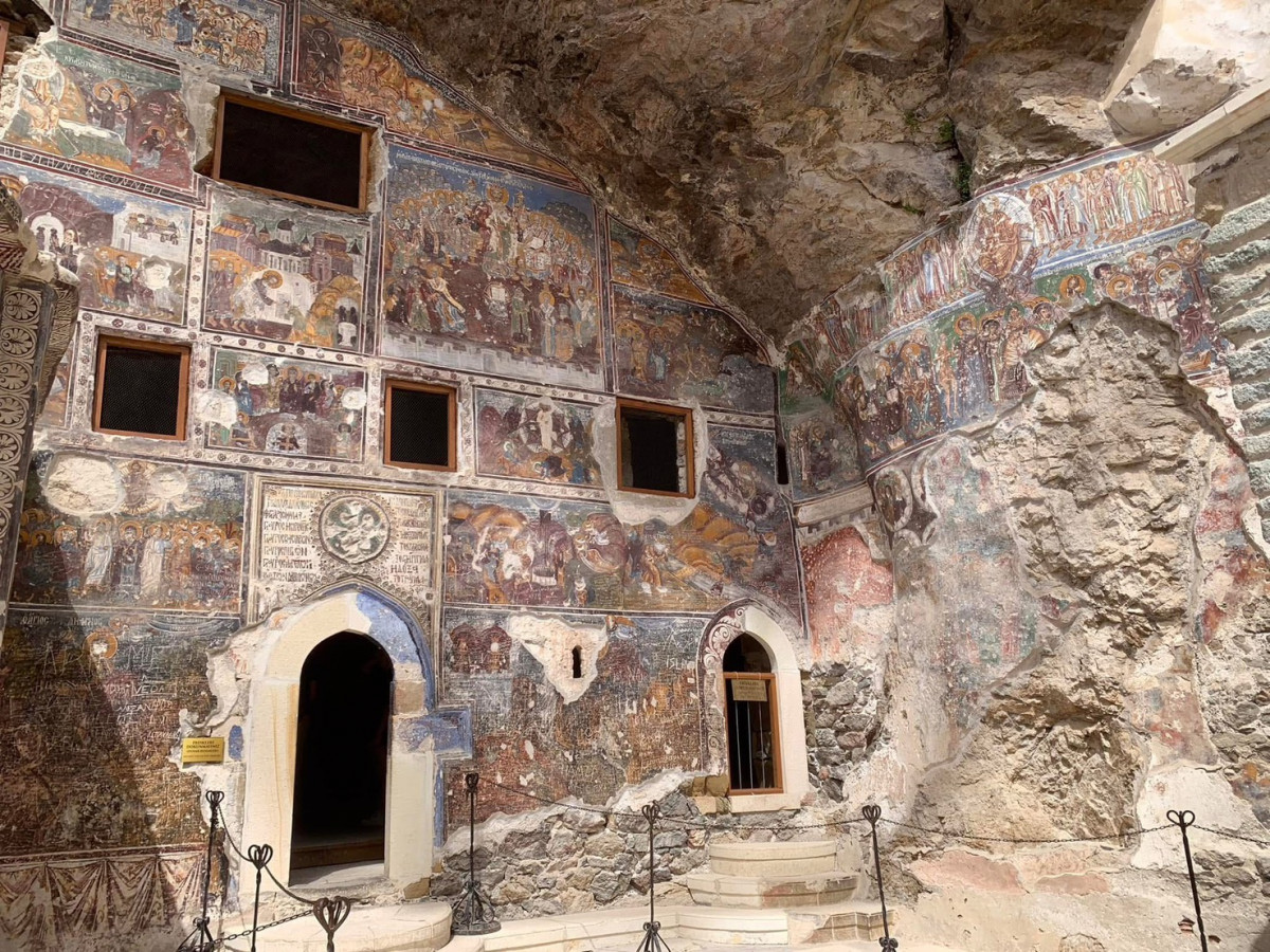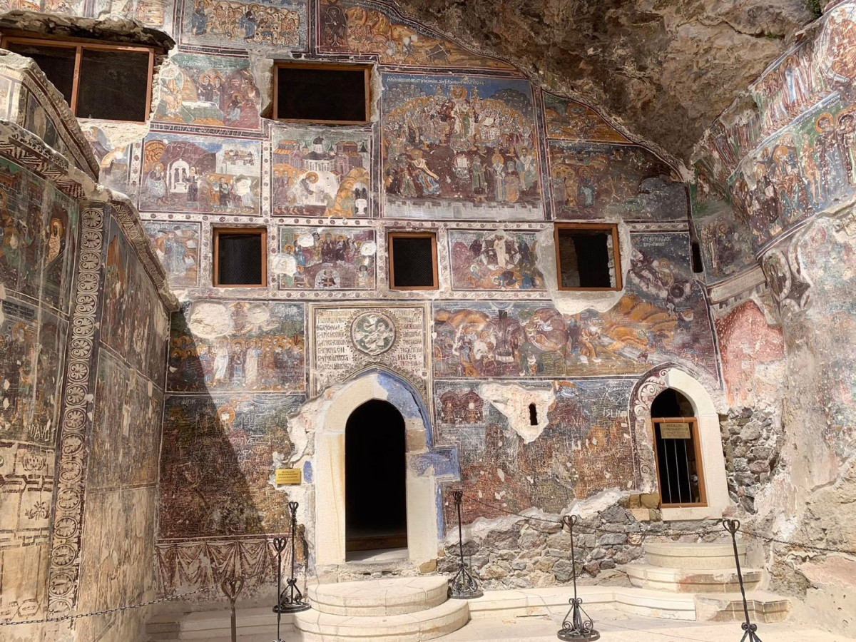 坐落於土耳其黑海特拉布宗省海拔 1200 公尺的峭壁間,蘇美拉修道院建於公元 386 年,至今已有 1600 年歷史。它曾受拜占庭、特拉布宗與鄂圖曼帝國庇護,如今歷經修復再現風華。沿著蜿蜒山徑而上,映入眼簾的是滿布《聖經》壁畫的教堂,即便斑駁,依舊震撼人心。