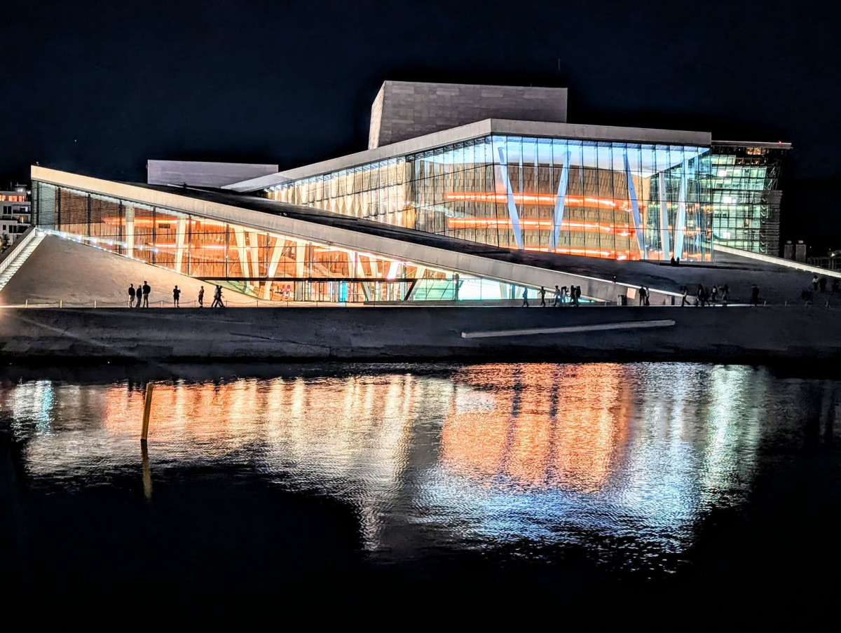 2008 年啟用挪威最大的表演藝術場館,位於奧斯陸峽灣旁,外觀以大理石與玻璃打造,屋頂設計為可步行坡道,象徵「人民可自由走進藝術殿堂」。