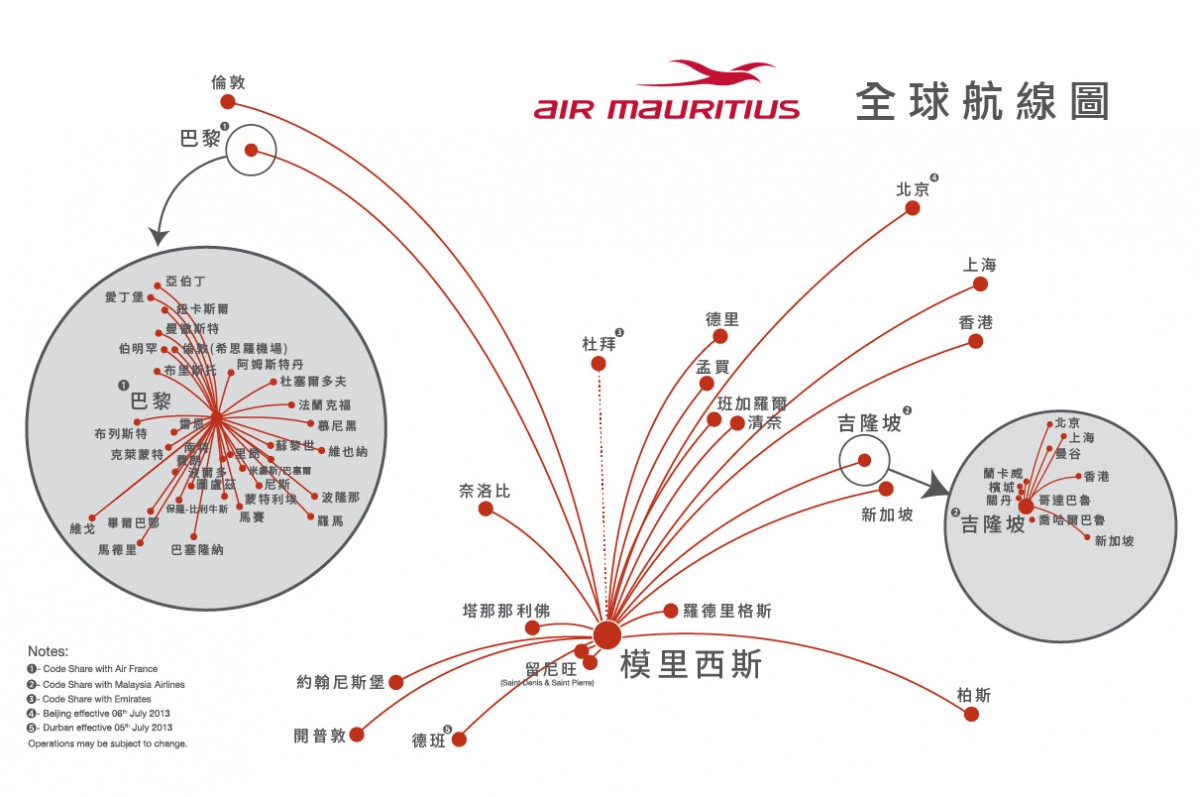 ● 也可以搭配模里西斯航空延伸點至馬達加斯加、留尼旺島或其他地區旅遊!