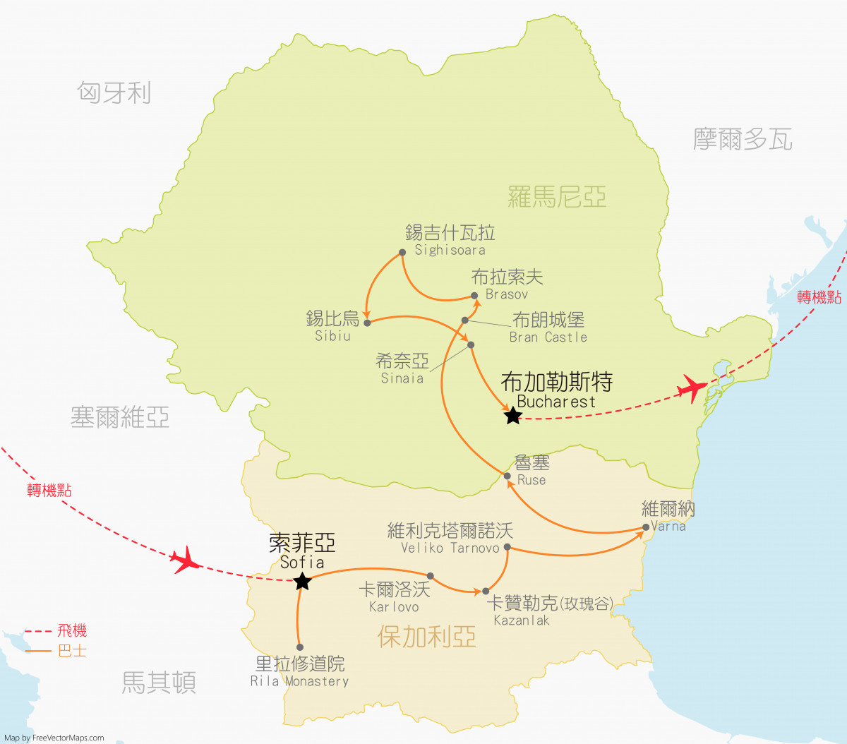 一年一度保加利亞玫瑰慶典:安排全日慶典活動,體驗在地年度最大盛會。 從玫瑰花香到王室城堡・走進東歐文明的心臟 玫瑰之谷嘉年華 王國與歷史的印記 信仰與藝術的融合 自然與人文景觀 古城與舊都漫遊 文化與歷史的交會 美食與文化體驗 參考航班: 行程地圖 ![]() 分日行程說明: