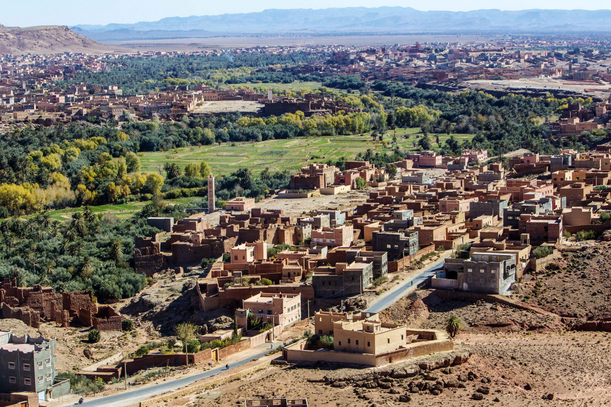 是一座柏柏人的城市,周圍景緻雖然乾燥貧瘠,但放眼望去平坦黃土大地的遠方是一座寬廣海拔高度3737公尺的阿雅齊山(Jebel Ayachi),山腰以上覆蓋著白雪,十分的壯觀。