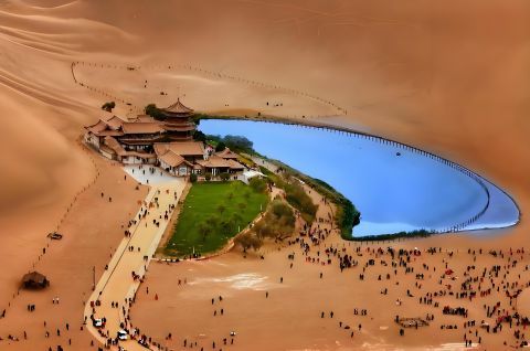 【鳴沙山,月牙泉(騎駱駝進,電瓶車出)】敦煌鳴沙山沙粒有紅、黃、藍、白、黑五種顏色,晶瑩透亮,一塵不染。沙山形態各異:有的像月芽兒,彎彎相連,組成沙鏈;有的像金字塔,高高聳起,有棱有角;有的像蟒蛇,長長而臥,延至天邊;有的像魚鱗,丘丘相接,排列整齊。由於山勢陡峭,攀登只能緩緩而上。下山時,沙粒會隨人流動,發出管弦鼓樂般的隆隆聲響,真是扣人心弦。 第 11天敦煌