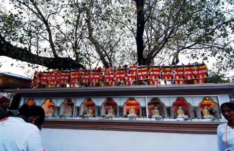 雖然佛祖頓悟的那棵菩提樹已經圓寂了,但目前在原地重栽。枝葉茂密的菩提樹,是19世紀從斯里蘭卡切枝移植而來的,四週外圍佈滿經文的大理石護欄(請看上面第一二張照片),內圍則是一圈佛相神龕,至於入口處有一涼亭,重建了2500年前佛祖對5位弟子說法的實況。