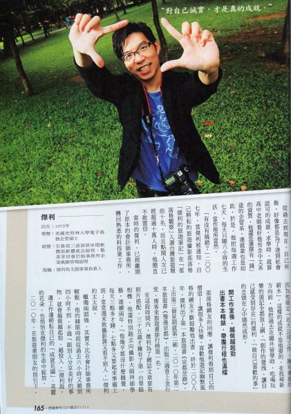 傑利很開心寄來這消息,公開與大家分享,期望他今年除了帶團,出書、攝影班、邀稿、上節目、、都順利開心。出刊日期是今天(11/14),由於網路尚未開放這篇連結,所以傑利用掃描的圖檔寄來,圖文我看起來還算清析,希望大家能順利悅讀,分享他活出的第二人生。 ![]() ![]() ![]()