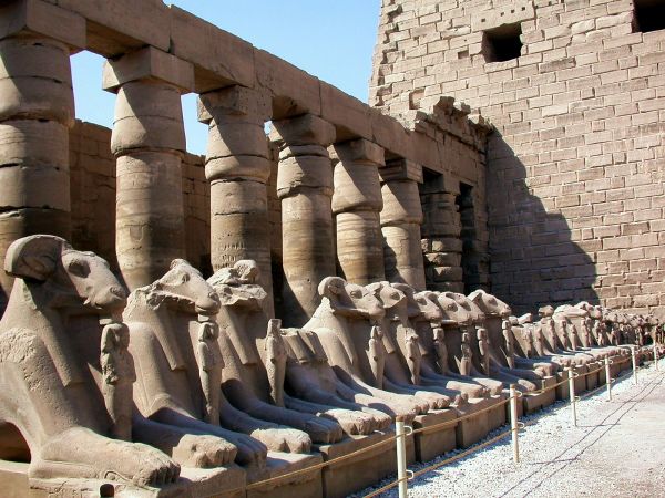 接下來遊客會踏上拉姆西斯二世所建的公羊大道,這條大道不長,但是另一條軸線上有一條長三公里的「公羊大道」與路克索神殿相連。埃及人相信公羊是阿蒙神在世間附身的對象(希臘的宙斯喜歡附身橄欖樹、阿波羅喜歡附身在鷹身上),所以公羊也是太陽神的標誌,公羊大道也可以叫它日光大道。緊接就來第一塔門,一一三公尺寬,十五公尺厚,雖然是第一門,其實它是最後才建造的塔門,由埃及的最後一個王朝,也就是三十王朝的奈克塔內博一世所興建,但是尚未完工,原始的大門是用青銅為主要材質所製,再飾以黃金等貴重金屬,但就是因為貴重,如今盪然無存。