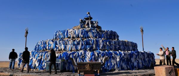 「敖包」蒙語意是「堆子」,用石頭、土堆、樹枝在山頂或丘陵上壘起來,能夠敬神靈鎮妖魔。蒙古族人每次路經敖包,都要順時針繞行三圈,並且添加幾塊石頭,以保佑平安。
