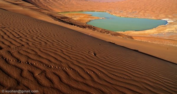 令人驚奇的是,沙漠中竟有許多大小湖泊,有些還滋養著非常蓬勃的生態。在靜謐的湖畔漫步,湖面碧波蕩漾,水鳥嬉戲蘆葦叢,天鵝與雁鴨悠游,構成沙水天相映的獨特沙漠景觀。