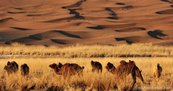 乘吉普車行駛內蒙古西部,火熱的土地遠方總是融化般的熱氣蒸騰,分不清是湖泊還是幻象。儘管窗外的風景連續幾個鐘頭沒變化,但可別一路昏睡,幸運時或可遇見野生黃羊在荒原中奔跑。途中偶爾出現一球球的戈壁植物,許多小蜥蜴咕嚕咕嚕地在矮叢間竄遊。
