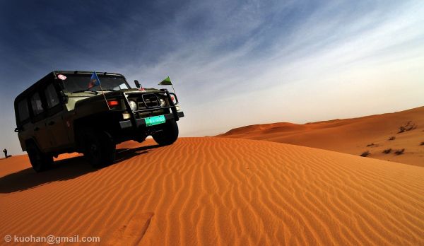 驅車深入由烏蘭布和、巴丹吉林、騰格里達來,組成的「阿拉善沙漠」。其中尤以巴丹吉林沙漠的巨大沙丘連綿不絕,在海拔1200~1700米之間,宛如海嘯般捲起巨浪,相對高度達500米的沙山,是世界最高的沙山,搭乘吉普車穿越其間,宛如衝浪般驚險刺激。