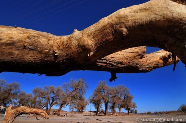 從額濟納旗往東1公里,經一道橋至七道橋之間,則是胡楊林景觀區。高齡數百歲的胡楊,仍枝繁葉茂,被譽為沙漠中活著的化石樹。很奇特的是,一株胡楊的葉片有柳葉形、卵圓型、楓葉形三種,又稱三葉樹。它的根部扎得很深,可吸收沙漠深處的水分,無懼沙暴或洪水,可耐寒熱澇旱,因此有「活著不死1000年,死後不倒1000年,倒後不朽1000年」之稱。由於生長期極緩,很多胡楊樹造型奇特而詭異。每年秋天是胡楊樹最美的季節,能欣賞金色波濤般的美麗景色。