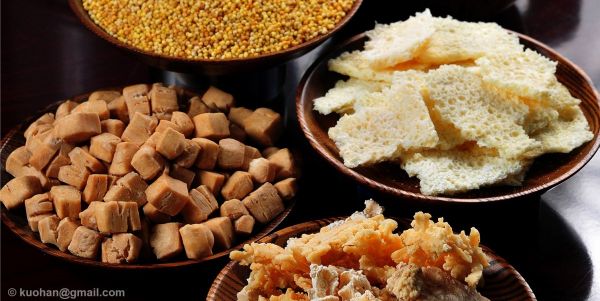 蒙古四小盤,包括炒米、奶皮、乳酪、起蛋子,可依個人喜好加在奶茶中,是熱菜上桌前必備的前菜。蒙古羊肉包子餡料十足,蒙古漢子一餐能吃一大盤。