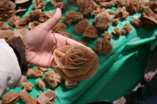 沙漠玫瑰其實就是撒哈拉沙漠的細沙,經過了地殼長時間的壓力之下,擠壓成類似結晶的塊狀,經過當地人深入沙漠地帶把它挖掘出來.販售的沙漠玫瑰,大至一根柱狀,小至掌上小可愛,狀似玫瑰,故名之.在一路上的旅遊行程中,沿途都會看到販售的沙漠玫瑰,一般旅客在結束行程前,一定會買好幾顆回來送人.在打包行李前,一定要注意小心包裝,不要把”玫瑰花瓣”弄斷了,不然回來可會搥心肝的.